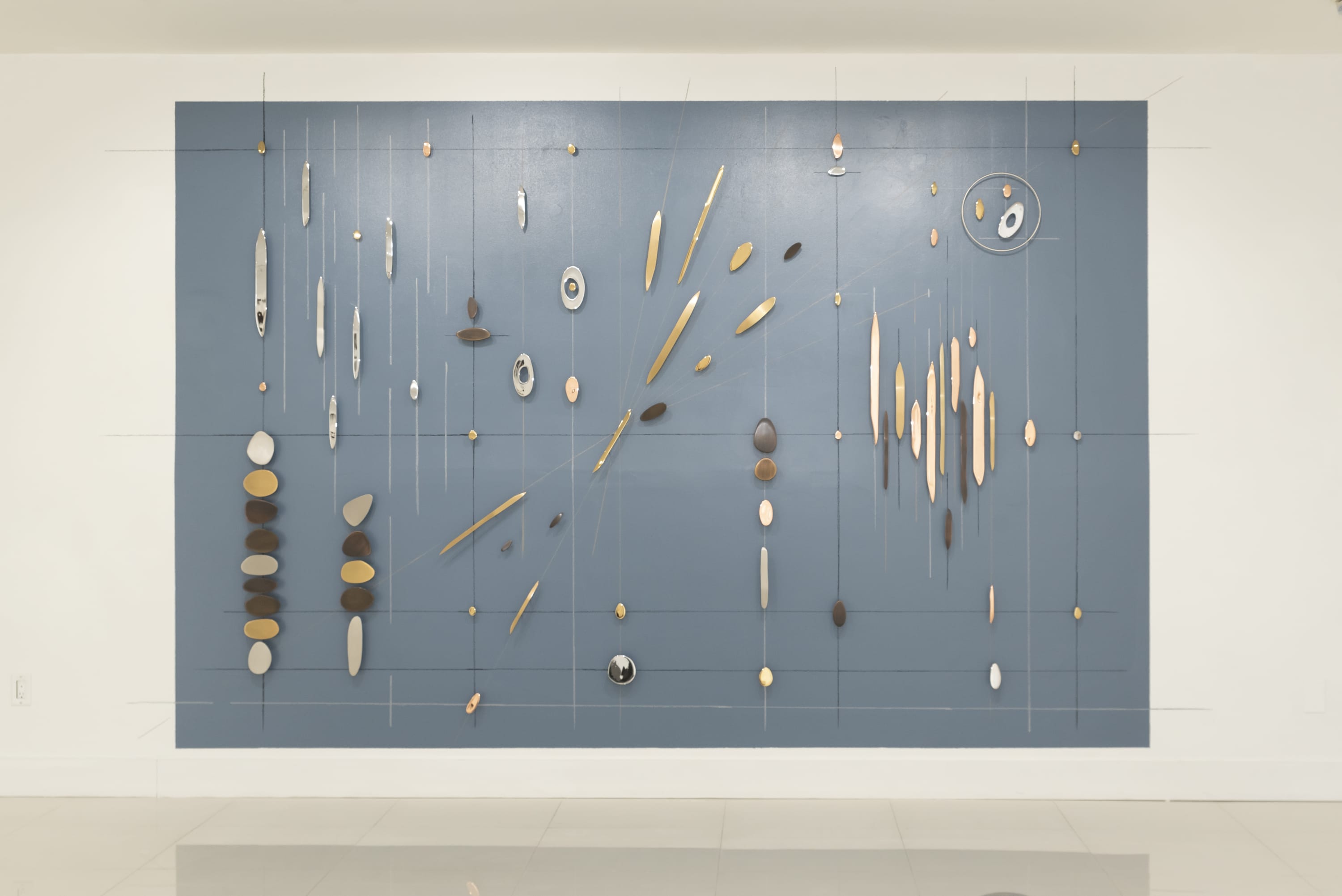 Plated Landscapes are large artworks engaged in an exploration of the two- dimensional space. The wall’s background is painted and directional lines are drawn to mark directions and to put in evidence the geometry behind the composition. Sculptural shapes are plated in metallic finishes that are either mirror polished to reflect the viewer or matte to draw attention to the shape itself. Each one of these Landscapes tell a different story open to multiple interpretations by the spectator that is looking at them.